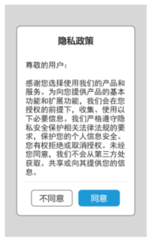 App首次运行时应当有隐私弹窗,隐私弹窗中应公示简版隐私政策内容,明示收集使用个人信息的目的、方式和范围,并附完整版隐私政策链接,并确保《隐私政策》链接正常有效,易于访问和阅读。隐私弹窗应明确提示最终用户阅读并选择是否同意隐私政策,应提供同意按钮和拒绝同意的按钮,并由最终用户主动选择